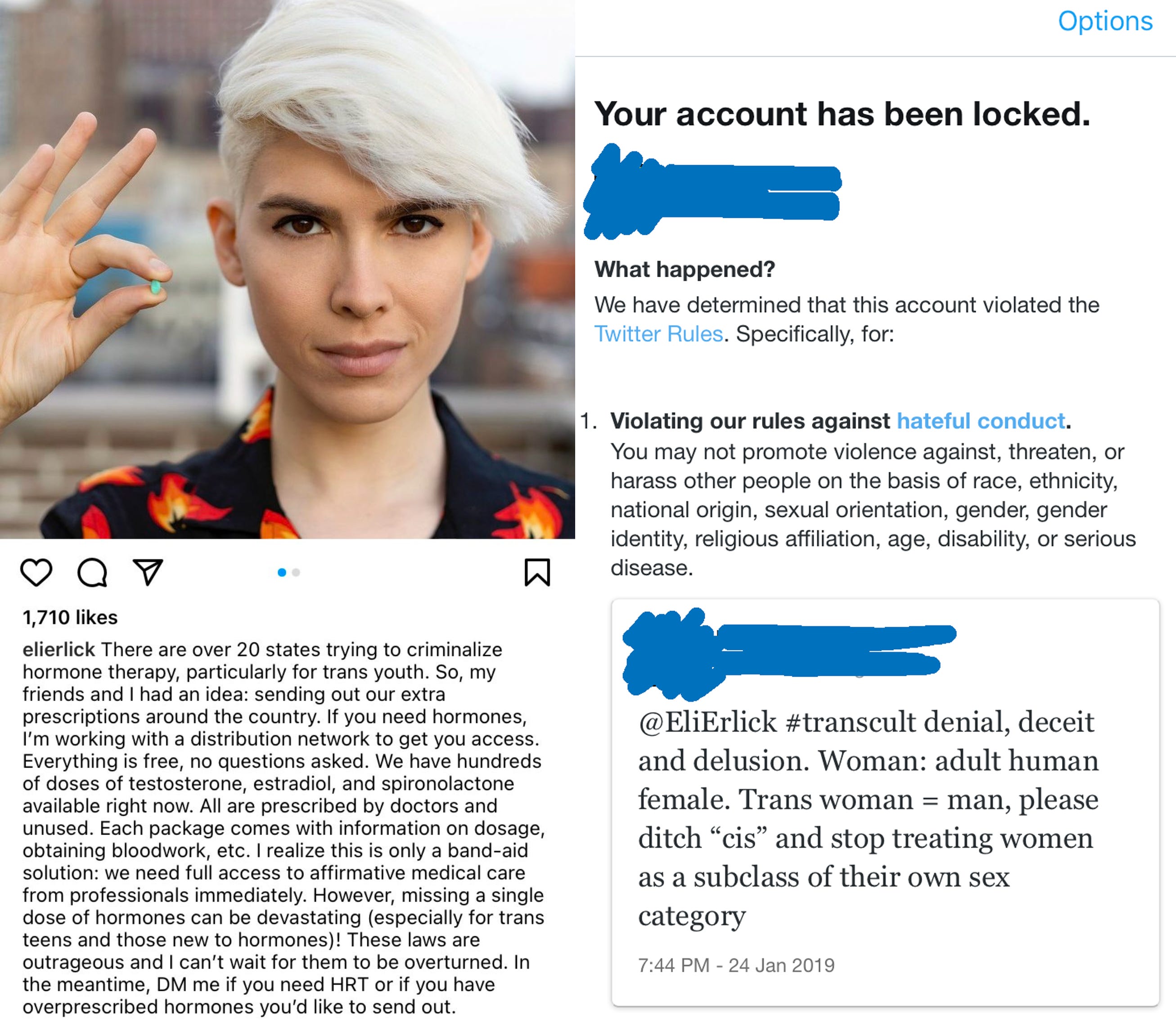 Reminded me of one of my many earlier bans (below, rhs) although at the time the name Eli Erlick didn’t mean much to me - just another TRA, but this is them today (lhs) just handing out the hormones like smarties on Instagram. These people need locking up