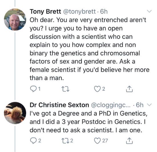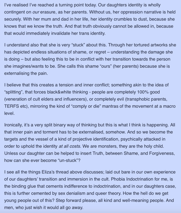 Yes, parents who haven't got on the affirmation train, tweeting out pictures of their son in a bikini like that judge in California who ruled against the dad saying he just wanted his son to slow down and get proper treatment for some other issues, are erased. Also the ex-wives. I just found out a new trans widow memoir will come out on Oct. 6; 18 Months by Shannon Thrace. The DARVO narrative is so obvious: deny, attack, reverse victim and offender. The fact that you recognize how brittle and breakable your daughter's art and self-expression are will help you to focus on your own well-being. Women's Declaration International YouTube channel just put up an interview with me, in which I outline the DARVO involvement of the mental health practitioners, who claimed that I broke up our family, by not trying to change my sexual orientation (btw, lesbians don't find these guys attractive either) and I was unwilling to live in a sexless marriage after the years of deceit. The asks from this cult are just so outrageous. Keep strong, Denton! The YT video title is the same as I sign here.